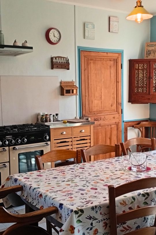 La cuisine de 40 m², cœur du Moulin des Prés, dispose d’un ancien fourneau et d’une décoration d’époque. Idéal pour les cuisiniers comme pour les amateurs de bons petits plats.